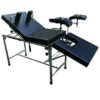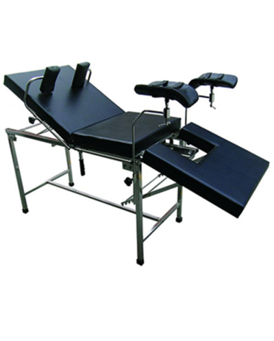 A 3-section delivery bed constructed from stainless steel rectangular pipe section with adjustable backrest and foot section. The foot section has a penial cut and the mid-section has a stainless steel pull-out washbasin beneath. The feet of the delivery bed is fitted with plastic stumps. Supplied with 50mm mattress covered with fire retardant, washable, vinyl fabric, shoulder support, and knee crutches.