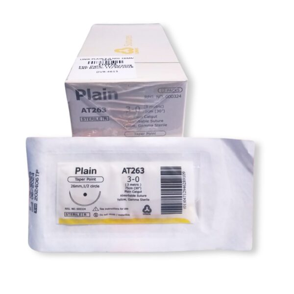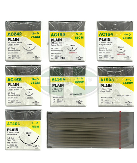 Plain Catgut is a uniform, firmly twisted strand of collagen made of the serosa layer of bovine intestines. The purified strands, after electronic gauging and polishing, form a virtual monofilament with exceptional handing properties. It is indicated for use in general soft issue approximation and/or ligation, including use in ophthalmic surgery.