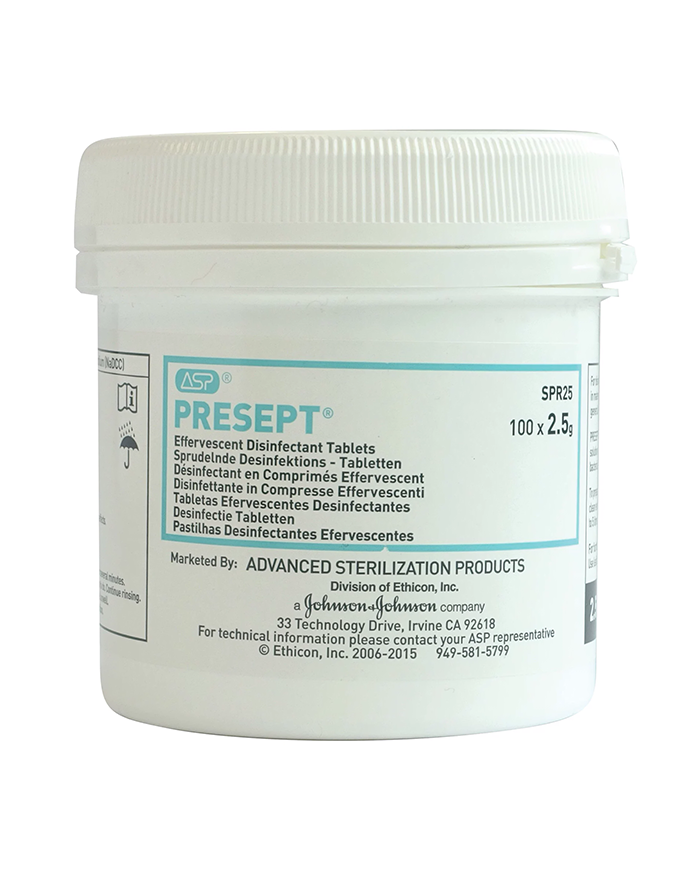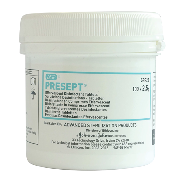 Presept Tablets contain sodium dichloroisocyanurate (NaDCC) in an effevescent base and when dissolved in water are effective through the entire biocidal spectrum and are highly resistant to inactivation by organic soilage.